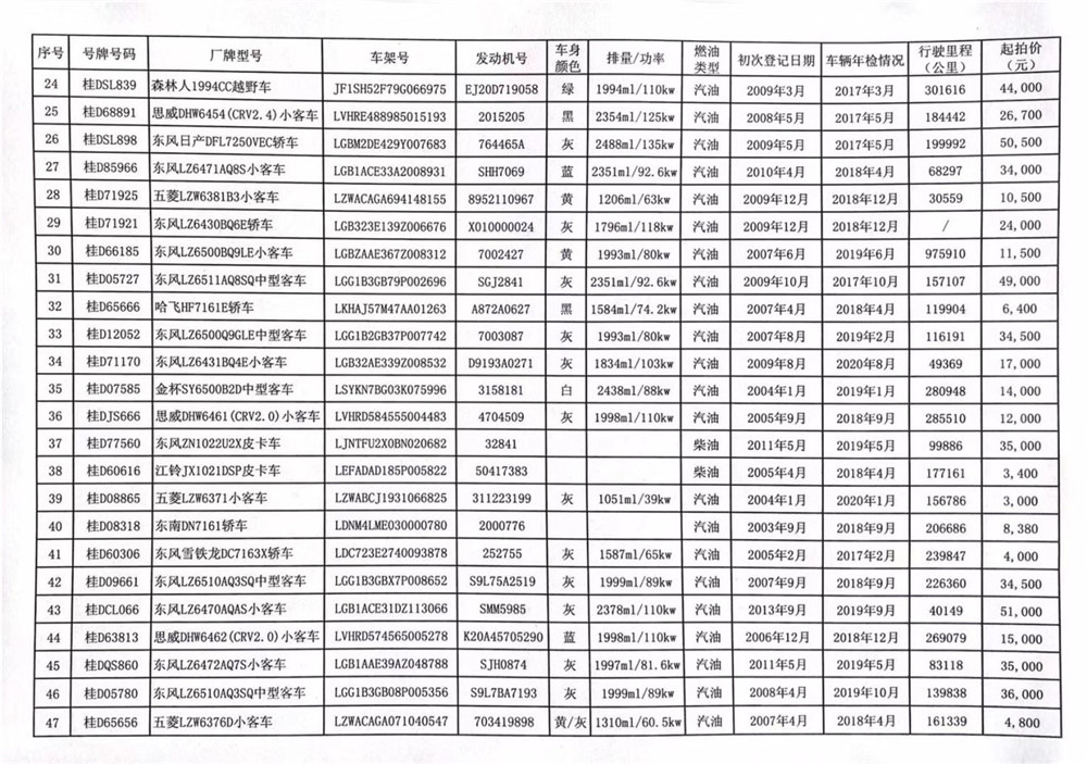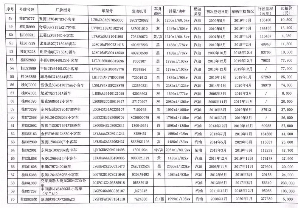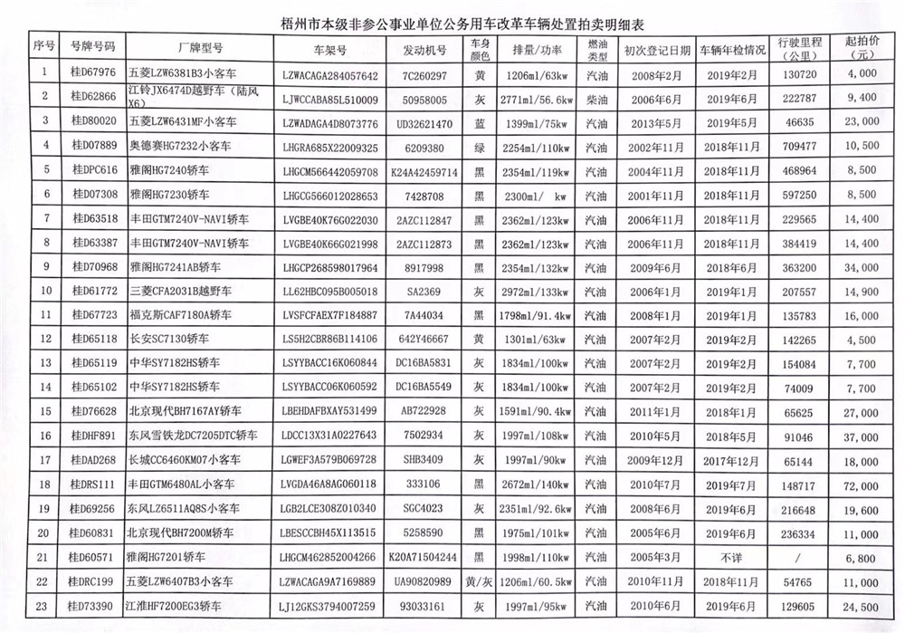 受梧州市財政局委托,我公司定于2019年12月31日上午9:30,在梧州市中恒體育館按車輛現狀公開拍賣:奧德賽、別克、豐田、漢蘭達、三菱、雪佛蘭等69臺車輛,車輛展示現場接受咨詢,競買保證金5000元/輛,有意競買者請于2019年12月30日下午5時前將競買保證金匯入指定賬戶:(戶名:廣西東華拍賣有限責任公司,開戶行:建行梧州河東支行,賬號:45001648652050700227),并持有效身份證原件及復印件、銀行匯單(以匯款到賬為準)及銀行卡復印件1份,到本公司辦理競買手續,逾期不接受報名,詳情請與本公司聯系,詳細資料備索。 車輛展示地點:梧州市中恒體育館2號停車場; 車輛展示時間:2019年12月20日—2019年12月30日 報名時間:2019年12月25日-12月30日17:00時止 報名地址:梧州市中恒體育館2號停車場 咨詢電話:0774-5830639、13977408181、13907847775 廣西東華拍賣有限責任公司 2019年12月20日