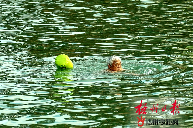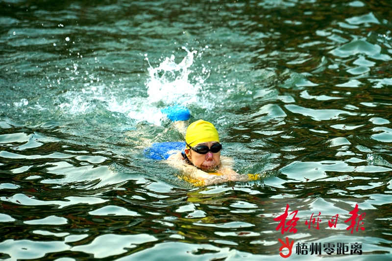 在冬泳西江基地,一名80歲的老人不畏寒冷堅持冬泳。 中午時分,陽光灑落在梧州游泳場,水陸溫差接近10℃。退休的冬泳愛好者吳志和中老年同伴、年輕的自由職業者們聚集在一起熱身、曬陽光浴,舒展一輪過后就順著扶梯滑入水中。他們來回切換泳姿,雙手劃出的水花在冰冷的河水中綻放。