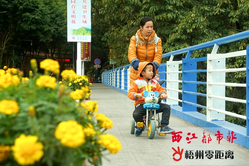 近日,我市對桂江一橋實施了噴涂翻新工程,橋墩、橋拱和護欄等均噴上了藍白顏色。噴涂翻新后的橋面護欄與黃花盛放的花卉盆景相映襯,使梧州街頭又添一景。記者 楊揚 攝