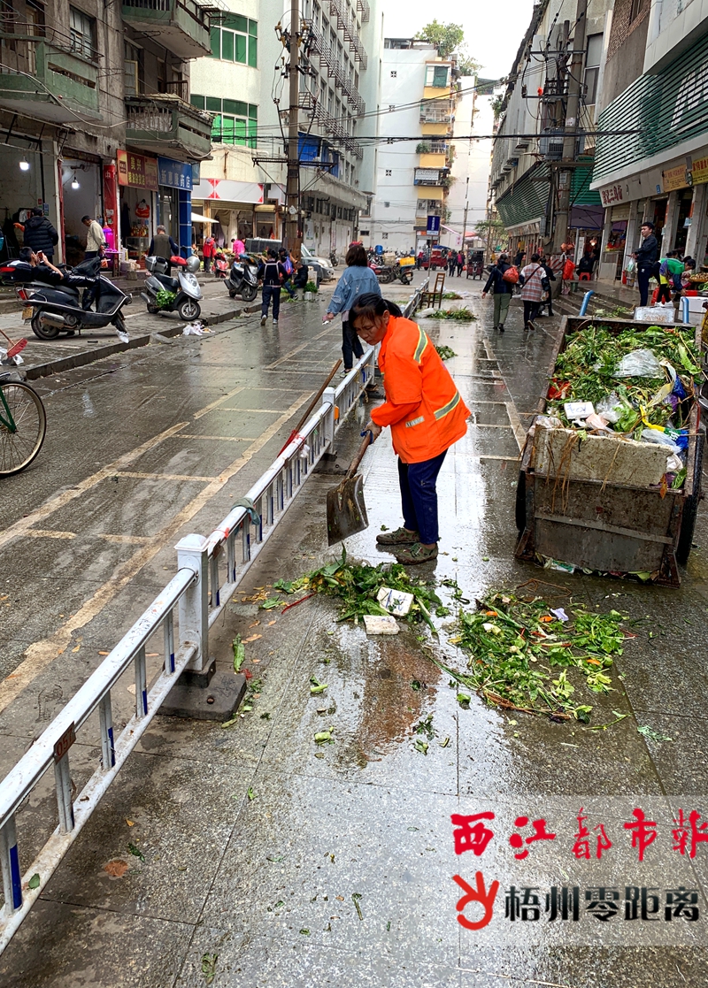 新興市場農民直銷區收市后環衛工人馬上清掃。 西江都市報記者 陳雨燕 |