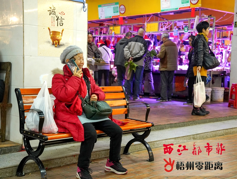 12月25日,市民坐在萬秀區怡景市場肉類行的座椅上休息。 今年以來,全市實行農貿市場規范化升級改造行動,每個城區都打造1至2個標準化農貿市場。這些市場分別為萬秀區的南中市場、河西綜合市場;長洲區的大塘市場、新城市場;龍圩區的龍湖市場、大園塘市場。
