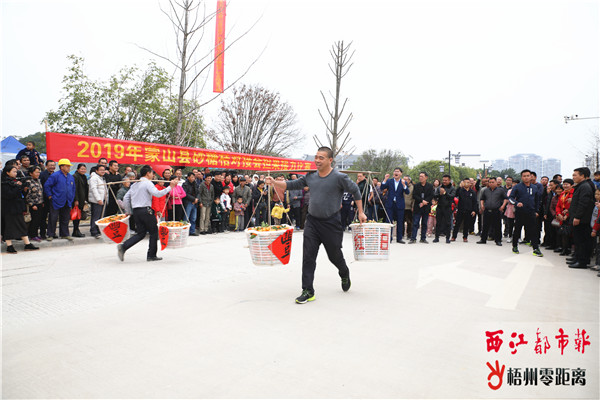 12月28日,蒙山縣舉辦以“決戰脫貧攻堅、推動鄉村振興”為主題的2019年扶貧產業產品推介暨砂糖橘產銷對接會,線上線下推介蒙山縣靈芝、蜂蜜、百香果、砂糖橘等扶貧產業產品,拓寬銷售渠道。現場還舉行了文藝演出,以及擔果、搬化肥接力比賽等活動,吸引眾多群眾前來觀看和參與。