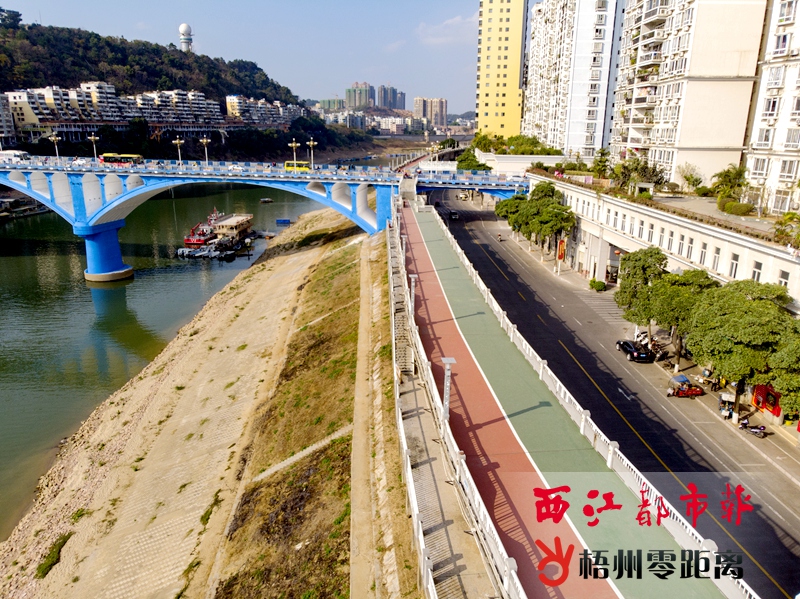 1月8日,河東防洪堤紅綠色的堤頂路連接起鴛江大橋和桂江一橋的人行道。 近日,河東防洪堤桂江段堤頂約1.4公里的步道完成施工并解除封閉。該段堤頂路的路面、圍欄、照明得到翻新,防洪堤配套設施得到進一步提升。
