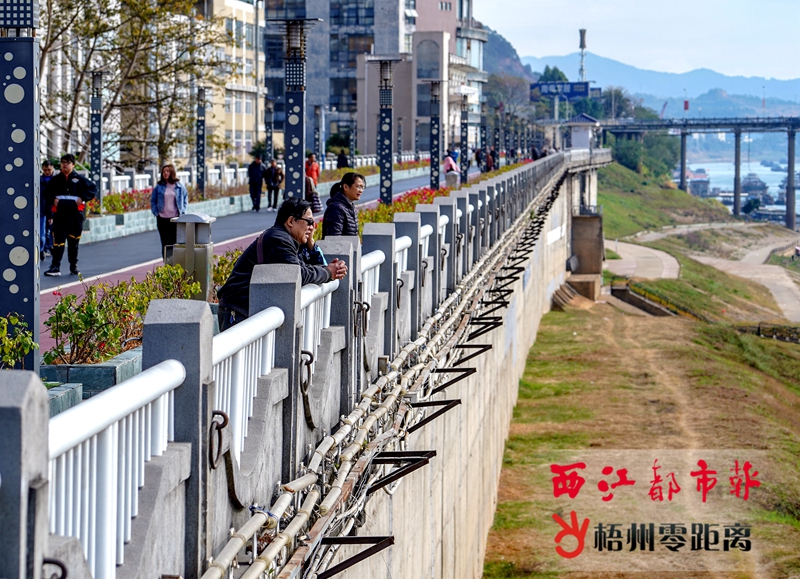 1月12日,平坦的堤頂路,開闊的江景,使河東防洪堤成為市民散步休閑好去處。