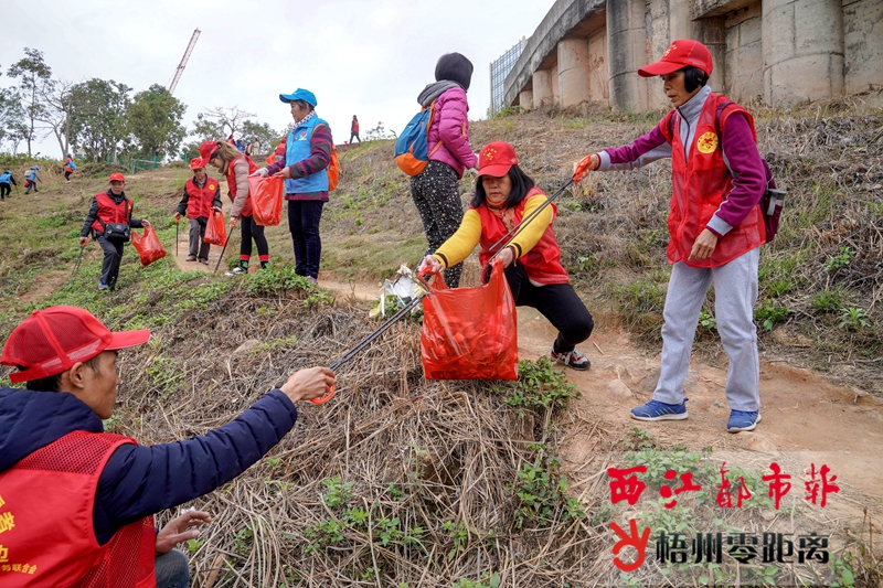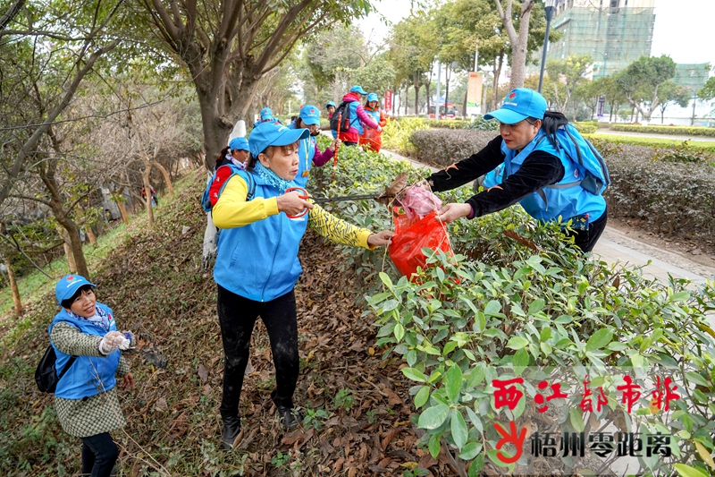 1月13日,數十名志愿者分散在梧州市新時代文明實踐中心西側下坡和綠化帶處拾垃圾。
