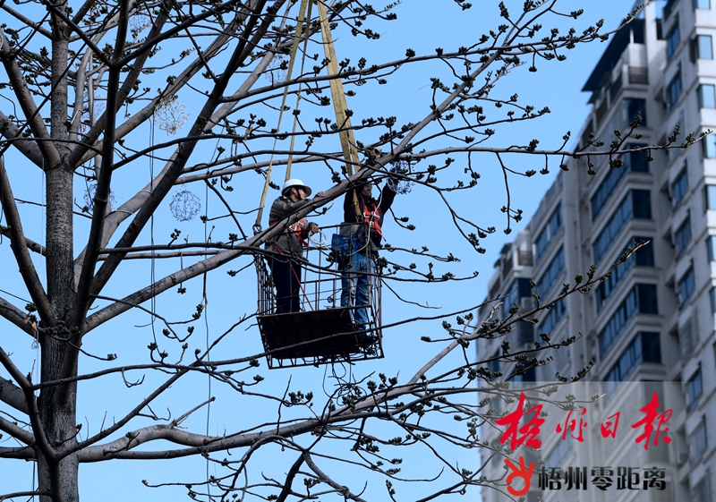 1月15日,施工人員在市政府大樓對出十字路口綠化帶的木棉樹上掛裝球狀彩燈。當天,市政部門在該路段的木棉樹上掛裝一個個的球狀彩燈,為城市夜景增添光彩。記者 蒙紹松 攝
