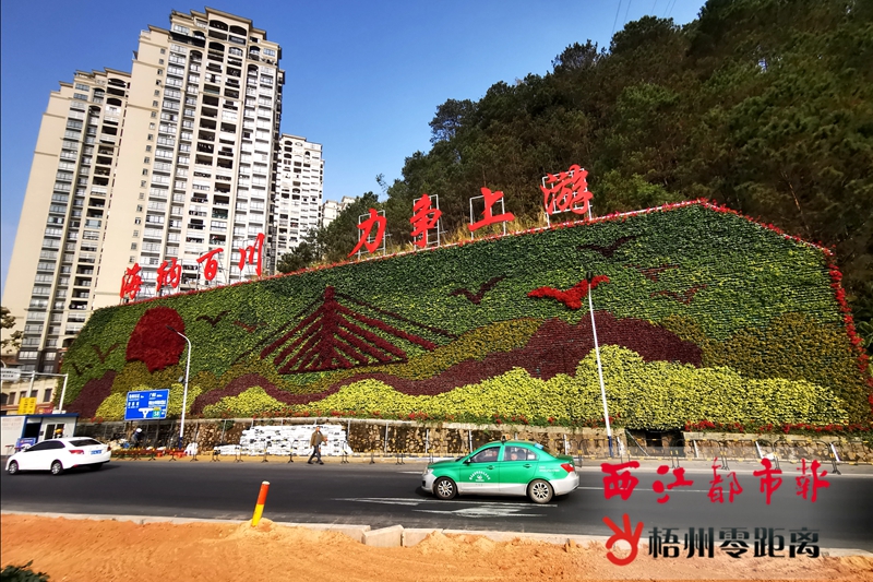 1月15日,在云龍橋北橋頭轉(zhuǎn)盤處,巨幅綠化造型完成施工與市民見面。該幅造型畫以山巒、云海、紅日、飛鳥和云龍橋為設計元素,由不同顏色的盆栽植物碼放組成,緊貼山體護坡建設,造型畫掛立著“海納百川、力爭上游”新時代梧州精神的標語,和旁邊的噴水池相互映襯。