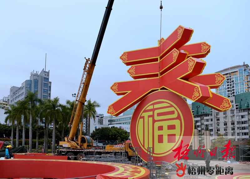 1月16日,在市政廣場(chǎng),施工機(jī)械正在吊裝大型立體春字造型景觀。