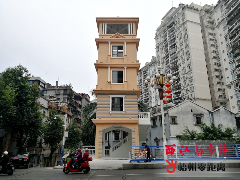 1月16日,完成翻新改造的桂江一橋河東橋頭塔樓外觀煥然一新。據悉,為配合桂江一橋提升改造工程,相關部門對該塔樓進行翻新改造,涉及外立面翻新、內部裝修、燈光亮化等施工。記者 吳艷虹 攝