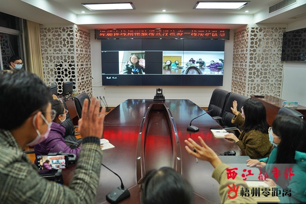 2月6日,西江都市報記者與梧州首批馳援武漢抗疫一線醫(yī)療隊的隊員們連線交流。記者 陳凡 攝