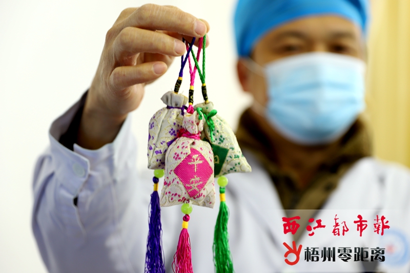 梧州零距離網-西江都市報訊 為積極應對當前疫情防控的嚴峻形勢,充分發揮中醫治未病在疫病預防等方面的優勢,梧州市中醫醫院名老中醫團隊繼推出防疫茶后,又推出適合梧州地域特色的防疫香囊。 該香囊采用艾葉、佩蘭、藿香、蒼術、石菖蒲等各10克,打碎(60目),均分2份,裝入無紡布袋內,佩戴香囊袋使用。白天,市民可將香囊掛在胸前,距鼻腔15厘米左右,晚間則可置于枕邊,對預防新型冠狀病毒肺炎有一定功效。