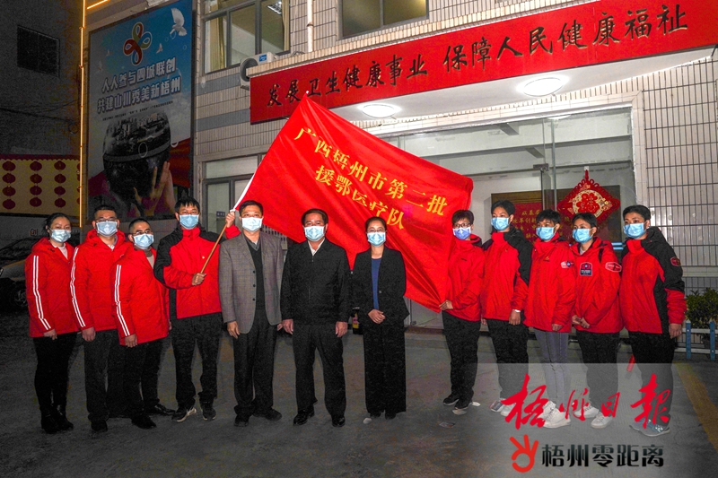 2月11日,梧州市第二批援助湖北醫療隊出發馳援湖北十堰市,市領導全桂壽、鐘暢姿、黃振饒看望醫療隊隊員,為大家加油鼓勁。 記者 楊揚 攝 晚上7時許,市領導全桂壽、鐘暢姿、黃振饒趕到市衛生健康委,為出征隊員加油鼓勁。市委書記全桂壽一一了解了本次隊員的所屬醫院及家庭、履歷等情況,對隊員們主動支援的行為給予高度評價。他表示,之前梧州5例確診病例均已治愈出院,醫務人員在應對新冠肺炎疫情中取得了階段性成績。十堰市是我國中部著名的汽車城,本次出征的梧州醫務人員代表著350萬梧州市民的希望,大家在做好工作的同時保護好自己,展現出“海納百川、力爭上游”新時代梧州精神。隨后,隊員們集體宣誓,接過全桂壽的授旗,踏上馳援十堰的征程。 據了解,湖北十堰市人口300多萬,是知名景區武當山的所在地,距梧州1300千米之遠,由廣西壯族自治區負責對口支援。第二批援助湖北醫療隊梧州隊長、市工人醫院副院長張春表示,截至11日中午,十堰市已經確診新冠病毒感染病例超500人,由于前方的具體情況未明,目前醫療隊員們都帶夠了至少一周的生活和醫療防護物資以應對疫情,處于后方的全市醫療機構也將根據前線的需要隨時支援。 據了解,本次我市出征的9名醫護人員主要為重癥醫學科、內科的醫生和護士,都是治療新冠肺炎的對口專業,可有效滿足十堰市醫療救治需求。