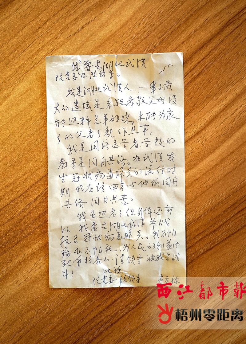 西江都市報記者 陳素雅 通訊員黃舒捷 “我是湖北武漢人……我雖然老了,但身體還可以,我要去湖北武漢參戰抗擊新型冠狀病毒肺炎。我不怕病亦不怕死,為人民的利益而死重于泰山,請領導派我去戰斗!”
