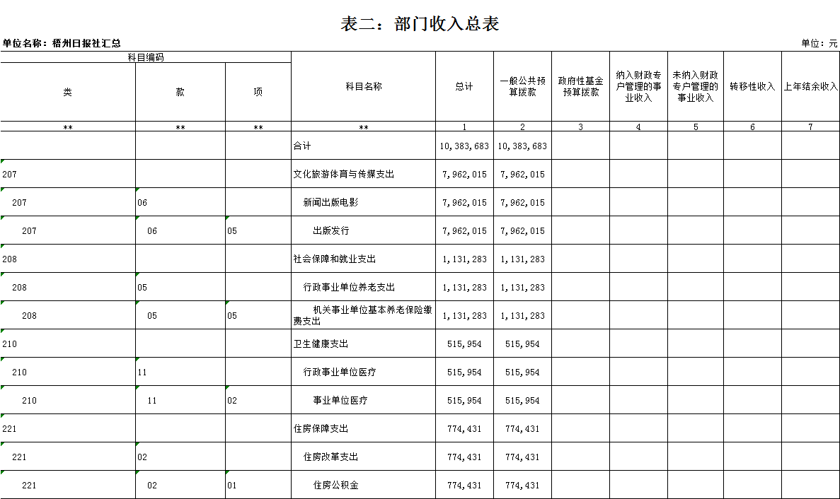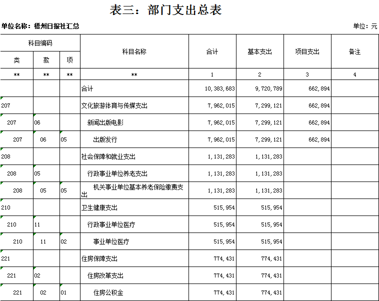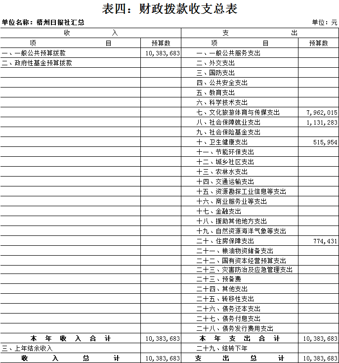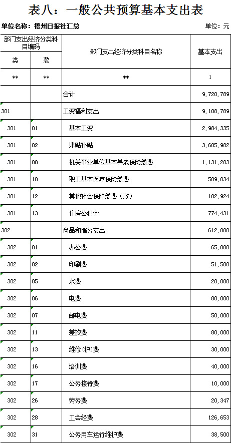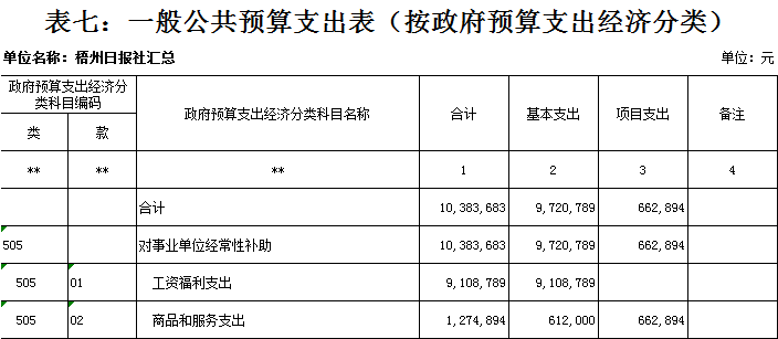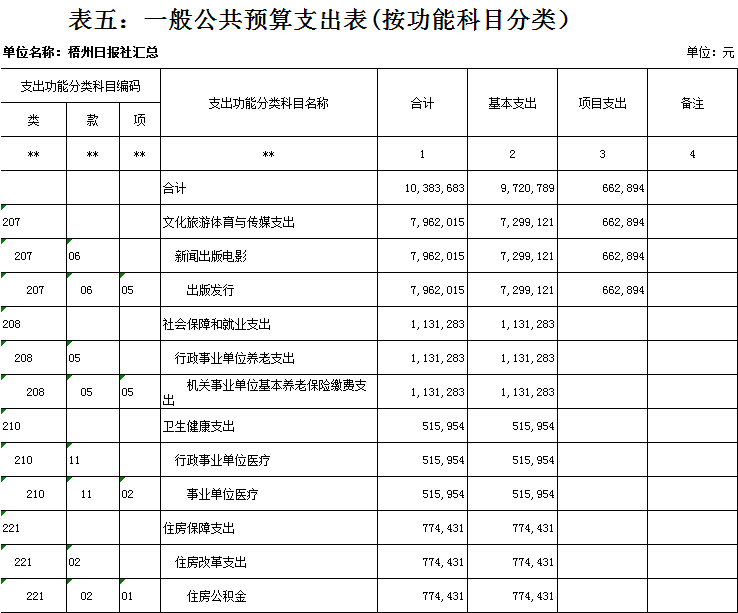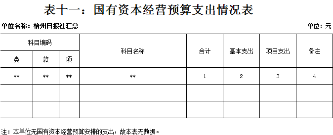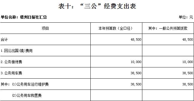 梧州日?qǐng)?bào)社2020年 部門(mén)預(yù)算及“三公”經(jīng)費(fèi)預(yù)算 目 錄: 第一部分:部門(mén)概況 一、基本情況(列舉部門(mén)主要職能) 二、機(jī)構(gòu)設(shè)置、編制現(xiàn)狀情況(包含基層預(yù)算單位組成、單位性質(zhì)) 三、人員構(gòu)成情況(包含基層預(yù)算單位人員構(gòu)成、經(jīng)費(fèi)管理方式) 第二部分: 2020年部門(mén)預(yù)算報(bào)表(詳見(jiàn)附件) 1.部門(mén)收支總表 2.部門(mén)收入總表 3.部門(mén)支出總表 4.財(cái)政撥款收支總表 5.一般公共預(yù)算支出表(按功能科目分類(lèi)) 6.一般公共預(yù)算支出表(按部門(mén)經(jīng)濟(jì)科目分類(lèi)) 7.一般公共預(yù)算支出表(按政府經(jīng)濟(jì)科目分類(lèi)) 8.一般公共預(yù)算基本支出表 9.政府性基金預(yù)算支出表 10.“三公”經(jīng)費(fèi)支出表 11.國(guó)有資本經(jīng)營(yíng)預(yù)算支出情況表 第三部分:2020年部門(mén)預(yù)算情況說(shuō)明 一、2020年部門(mén)收支總體預(yù)算情況 二、2020年部門(mén)財(cái)政撥款收支預(yù)算情況 三、2020年政府性基金預(yù)算支出預(yù)算情況 四、2020年部門(mén)預(yù)算安排的“三公”經(jīng)費(fèi)預(yù)算情況 五、其他情況說(shuō)明 第四部分:專(zhuān)業(yè)名詞解釋 第一部分:部門(mén)概況 一、 基本情況(列舉部門(mén)主要職能) 梧州日?qǐng)?bào)社是梧州市委主管的新聞機(jī)構(gòu),負(fù)責(zé)宣傳黨的路線、方針、政策,傳播梧州市主流新聞和其他信息,大力弘揚(yáng)時(shí)代主旋律,圍繞市委市政府的中心工作,服務(wù)大局,反映人民群眾的心聲,為梧州政治經(jīng)濟(jì)社會(huì)文化發(fā)展?fàn)I造良好的輿論氛圍,促進(jìn)梧州地方社會(huì)經(jīng)濟(jì)文化發(fā)展。 負(fù)責(zé)出版《梧州日?qǐng)?bào)》和《西江都市報(bào)》,經(jīng)營(yíng)《梧州零距離網(wǎng)站》以及其他書(shū)報(bào)刊,從事相關(guān)印刷、發(fā)行、報(bào)紙廣告經(jīng)營(yíng)業(yè)務(wù)。分管西江月文藝雜志社,主管梧州日?qǐng)?bào)社印刷廠。 二、 機(jī)構(gòu)設(shè)置、編制現(xiàn)狀情況(包含基層預(yù)算單位組成、單位性質(zhì)) 根據(jù)規(guī)定,并結(jié)合本單位實(shí)際,我單位共有12個(gè)職能科室,即:黨委辦公室、總編辦公室、財(cái)務(wù)室、發(fā)行部、廣告部、采編中心、專(zhuān)刊中心、群工部、經(jīng)濟(jì)專(zhuān)刊部、新聞研究室、西江都市報(bào)、梧州零距離網(wǎng)站。共有2個(gè)下屬單位:西江月文藝雜志社(科級(jí)差額補(bǔ)助預(yù)算管理事業(yè)單位)和梧州日?qǐng)?bào)社印刷廠(副科級(jí)自收自支事業(yè)單位)。 梧州日?qǐng)?bào)社屬于差額預(yù)算管理事業(yè)單位,梧州日?qǐng)?bào)社印刷廠屬于自收自支管理事業(yè)單位,西江月文藝雜志社屬于差額預(yù)算管理事業(yè)單位。 三、 人員構(gòu)成情況(包含基層預(yù)算單位人員構(gòu)成、經(jīng)費(fèi)管理方式) 梧州日?qǐng)?bào)社截至2020年1月末,在職職工167人,其中:梧州日?qǐng)?bào)社事業(yè)編制人員68人(正處干部 2人,副處干部5人,正科級(jí)干部6人,副科級(jí)干部9人,事業(yè)人員46人);西江月文藝雜志社事業(yè)編制人員3人;梧州日?qǐng)?bào)社印刷廠事業(yè)編制人員23人。編外聘用73人(未含投遞、臨時(shí)廣告人員)。 梧州日?qǐng)?bào)社截至2020年1月末,實(shí)有退休職工74人,其中:梧州日?qǐng)?bào)社事業(yè)編制退休人員42人,梧州日?qǐng)?bào)社印刷廠事業(yè)編制退休人員26人,西江月文藝雜志社事業(yè)編制退休人員6人。 梧州日?qǐng)?bào)社的經(jīng)費(fèi)管理方式屬于差額預(yù)算管理事業(yè)單位,梧州日?qǐng)?bào)社印刷廠屬于自收自支管理事業(yè)單位,西江月文藝雜志社屬于差額預(yù)算管理事業(yè)單位。 四、 年度主要工作任務(wù) 梧州日?qǐng)?bào)社負(fù)責(zé)出版《梧州日?qǐng)?bào)》和《西江都市報(bào)》,經(jīng)營(yíng)梧州零距離網(wǎng)站以及其他書(shū)報(bào)刊,從事相關(guān)印刷、發(fā)行、報(bào)紙廣告經(jīng)營(yíng)業(yè)務(wù)。西江月文藝雜志社負(fù)責(zé)出版《西江月》雜志。 第二部分: 2020年部門(mén)預(yù)算報(bào)表(預(yù)算公開(kāi)報(bào)表作為附件掛在報(bào)告尾部,詳見(jiàn)附件) 第三部分:2020年部門(mén)預(yù)算及“三公”經(jīng)費(fèi)預(yù)算報(bào)表說(shuō)明 一、2020年部門(mén)收支總體預(yù)算情況 (一)收入預(yù)算說(shuō)明。 2020年收入總預(yù)算10383683元,同比減少346963元,下降3.23%。2020年收入預(yù)算總體減少的主要原因:因新媒體對(duì)紙媒?jīng)_擊日益明顯,報(bào)紙發(fā)行量下降,廣告收入明顯減少,單位年度上繳財(cái)政總額減少,導(dǎo)致?lián)芸铑A(yù)算減少;部分項(xiàng)目經(jīng)費(fèi)壓縮,使收入預(yù)算總體有所下降。 其中: 1、一般公共預(yù)算撥款10383683元,同比減少346963元,下降3.23%;經(jīng)費(fèi)撥款(補(bǔ)助)10383683元,主要是人員支出、社會(huì)保障和項(xiàng)目收入等。減少的原因是單位年度上繳財(cái)政總額減少,撥款預(yù)算減少;部分項(xiàng)目經(jīng)費(fèi)壓縮,使公共預(yù)算撥款下降。 2、本單位無(wú)政府性基金撥款收入,同比無(wú)變化。 3、本單位無(wú)納入財(cái)政專(zhuān)戶管理的事業(yè)收入