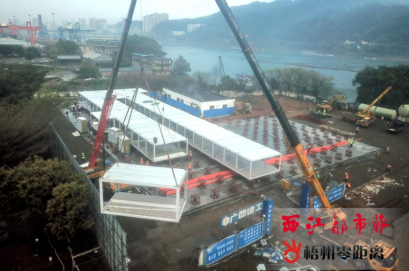 梧州零距離網-西江都市報訊(記者 吳艷虹)目前,梧州市第三人民醫院新冠肺炎后備應急病房建設工程項目正在如火如荼地開展。2月13日,記者從現場了解到,集裝箱鋼支座基礎已全部完成,200多名工作人員全部投入集裝箱吊裝及水電等安裝工作,爭取2月14日凌晨完成所有箱體吊裝。 當天早上,記者在施工現場看到,一臺大型吊機正在把集裝箱框架從運輸車上吊起,卸在地上后,多名施工人員協力把框架拼成一個箱體。然后,另一臺吊機將箱體整個吊起,移至鋼支座基礎上進行固定。據悉,為了固定箱體,施工人員將鋼支座先固定在混凝土地面上,再在箱體與鋼支座之間安裝墊片,增加其受力面。