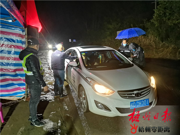 2月15日晚,夏郢鎮(zhèn)干部在答涓村值守點(diǎn)冒雨對(duì)過往車輛進(jìn)行登記,檢測(cè)司乘人員體溫。歐文強(qiáng) 攝