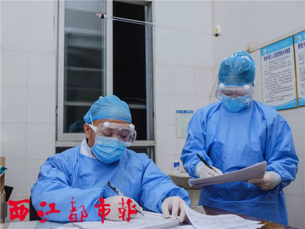 2月16日,市第三人民醫院,吳啟榮(左)在預檢分診室內篩查病例。 為應對新冠肺炎疫情,市第三人民醫院綜合科主任吳啟榮一整周都沒有回家,當天晚上已經是他在醫院度過的第七個夜晚。除了要負責排查新冠肺炎疫情病人,以及為發熱病人診治外,吳啟榮還負責各科室的日常病例的治療,每天晚上值完夜班后還要再查房,通常要忙到次日早上10時。“特殊時期,工作生活都在醫院,除了每天和家人視頻報平安,大部分時間都投入到工作中了。”吳啟榮說道。