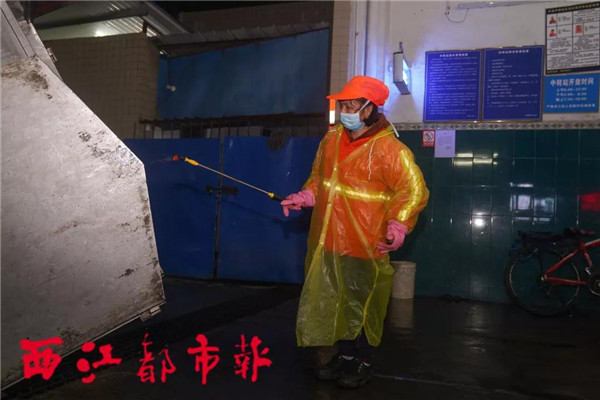 2月17日22時,新興三路萬寶樓,黃秀梅對環衛站內的設施進行消毒。 22時,新興三路萬寶樓的溫度只有10℃,黃秀梅要對環衛站內部進行最后一次消毒后才能下班。她當天6時就開始工作了,雖然天氣寒冷,但防護雨衣不透風,工作一會兒就悶出汗了,一天下來她換了三次衣服。疫情發生后,環衛站的消毒工作量翻了一倍,但黃秀梅沒有抱怨,她只希望疫情快些過去,街上能恢復往日的熱鬧。