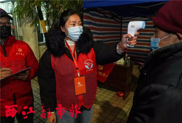 2月16日21時,寶泰花苑小區,唐東雁對出入小區的人員進行測溫。 每天7時30分至24時,豐業社區工作人員唐東雁和同事們輪流排班,值守在社區所轄的4個無物業住宅小區的出入口,負責對出入小區的人員進行測溫及登記等工作。人們從一開始不配合到主動接受測溫,唐東雁和同事們的工作得到越來越多住戶的認可及行動上的支持。感動之余,唐東雁覺得自己肩上的責任更重了。