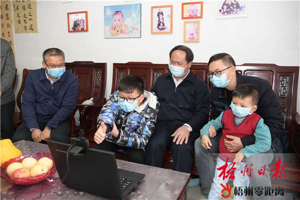 2月20日,市委書記全桂壽在赴湖北抗疫醫療隊員陳如均家中,和他的家屬一起與其視頻交流,向其及其家屬致以慰問。記者 蒙紹松 攝 連線中,全桂壽說:“我代表市四家班子和全市350萬人民,感謝你們首批17位白衣戰士為抗疫作出的貢獻。你們用自己的行動、真誠、責任,闡釋了敬佑生命、救死扶傷、甘于奉獻、大愛無疆,展現了舍小家為大家的精神。各級黨委、政府高度重視、關心關愛醫務工作者,希望你們按照醫院要求做好工作的同時,做好自身防護,出色完成任務,平平安安回來!我在梧州迎接你們凱旋?!薄爸x謝書記關心。我們一定出色完成這次任務!”陳如均表示。 全桂壽指出,陳如均等我市醫務人員,在國家最需要的時候,發揮黨員先鋒模范作用,主動請纓馳援湖北,這種大無畏的奉獻精神難能可貴,不愧為真正的白衣天使,不愧為守護人民生命安全和身體健康的忠誠衛士。各級黨委、政府要認真貫徹習近平總書記重要指示精神,關心關愛廣大醫務人員及其家屬,幫助解決困難問題,讓前方將士心無旁騖與湖北人民并肩作戰,努力戰勝疫情。希望家屬做好自身防護、守好家庭“后院”,給在一線抗疫的醫務人員更多溫暖。 市領導鐘暢姿走訪慰問了我市第三批赴湖北抗疫醫療隊隊長黃卓的家屬。黃卓是梧州市工人醫院感染管理科副科長,目前正在支援武漢市優撫醫院工作。 鐘暢姿來到黃卓家中,與其家屬親切交談,詳細了解他們的工作、生活情況。鐘暢姿向黃卓的家屬表示感謝,她說,醫療隊隊員們在抗擊疫情的最前線奮勇拼搏,離不開家屬的理解和支持,希望家屬們做好自身防護,確保健康安全,共同期待隊員們早日戰“疫”勝利、平安凱旋。