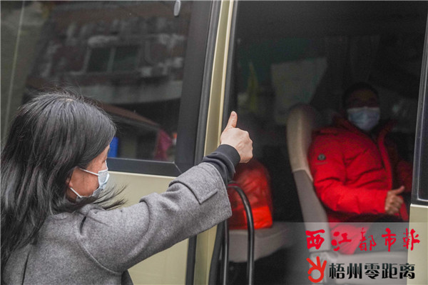 20日,親友送別梧州市第四批赴湖北抗疫醫(yī)療隊隊員。(記者 楊揚 攝) 在出征儀式上,市委書記全桂壽代表市委、市人大常委會、市政府、市政協(xié)和350萬梧州人民,向全體奔赴武漢戰(zhàn)“疫”一線的醫(yī)務(wù)人員表示崇高敬意和衷心感謝。他指出,我市派出支援湖北的醫(yī)護人員代表著梧州市乃至廣西的形象。7位醫(yī)務(wù)人員到了武漢戰(zhàn)“疫”一線后,要嚴(yán)格要求自己,與當(dāng)?shù)蒯t(yī)護人員通力合作,展現(xiàn)出梧州醫(yī)療最高水平,以精湛的醫(yī)術(shù)和良好的職業(yè)操守為患者提供及時有效的救治。市委、市政府以及全市人民將是醫(yī)療隊最堅強的后盾,全力支持前方工作,做好后方服務(wù)保障,悉心照顧隊員家人,切實解除隊員的后顧之憂。最后,全桂壽為醫(yī)療隊員們授旗,祝隊員們一路順利,平安歸來。 “醫(yī)院特意為我們準(zhǔn)備了抗疫中藥香包。這一次,我們將帶著梧州的藥香出發(fā)到湖北,希望能展現(xiàn)出高水平,戰(zhàn)勝疫情。”王展福19日接到出發(fā)通知,匆匆告知在廣西醫(yī)科大一附院進修的妻子張武愛后,便去接受疫情防控的重點培訓(xùn)。而張武愛身處南寧的抗疫一線,也不能回梧州為丈夫送行,于是通過微信叮囑王展福,一定要做好防護,平安歸來。 據(jù)了解,我市第四批醫(yī)療隊在20日下午抵達南寧,與區(qū)內(nèi)其他地市的醫(yī)療隊員集中后,于次日搭乘專機奔赴武漢開展醫(yī)療救治工作。 市領(lǐng)導(dǎo)黃振饒、吳浩嶺、李彤華出席出征儀式。