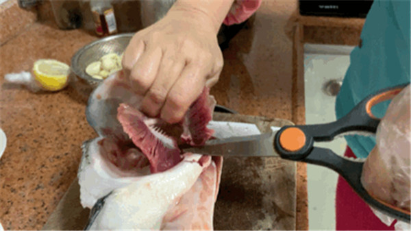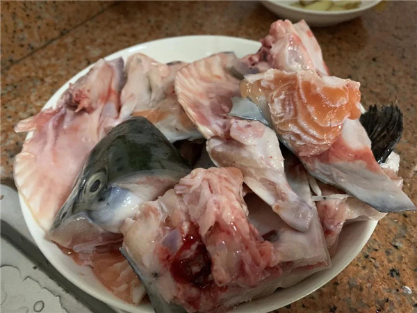 三文魚頭(魚尾肉厚脂肪多,干燜非常好吃); 姜10片; 大蒜1大把; 香蔥適量; 檸檬半只(按自己口味準備)。 生抽、蠔油、燒烤汁、料酒、胡椒粉、鹽、油各適量。 備料