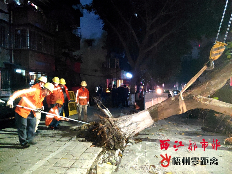 3月2日18時許,在西環路梧州市民政局對出路段,梧州市園林綠化工程處的工人對一棵倒伏的高山榕樹進行清理。