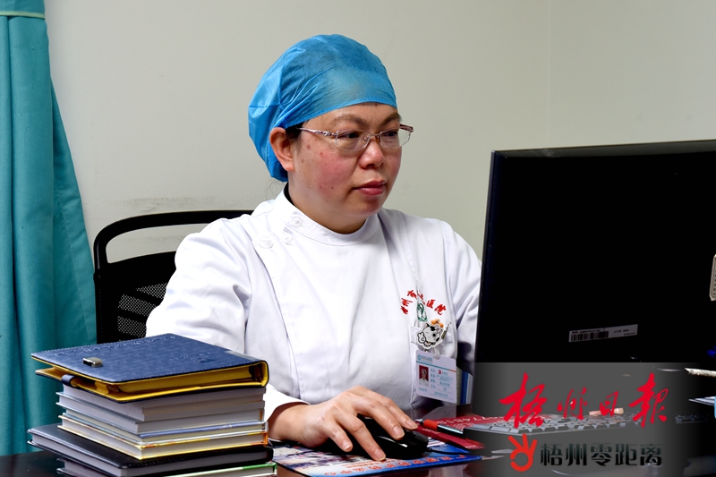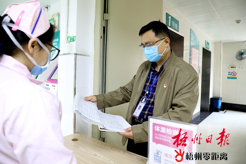 高興華在研究患者病情。 (圖片由市工人醫院提供) 父親如今這奮斗的身影,在兒子高浩巍眼中是多么熟悉的一幕:“2003年非典時我只有12歲,那年,父親也是這樣好長時間不能回家,因為醫護人員也要隔離。” 有了對父親工作的耳濡目染,作為市工人醫院的一名員工,當醫院需要招募志愿者到龍圩區大坡檢查站為過往車輛的司乘人員做體溫檢測,高浩巍馬上站出來:“我報名!我也要到一線去。”