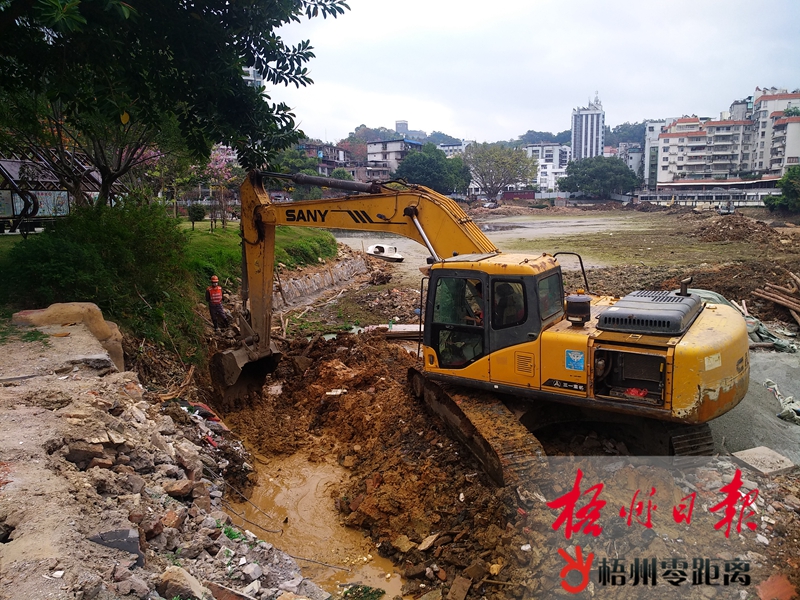 日前,我市開始對潘塘公園實施提升改造(二期)工程,計劃在下潘塘東南邊修建棧橋和觀景平臺,并逐步完善公園綠道和綠化景觀。目前,施工機械和工人正在清除魚塘內的淤泥、垃圾和雜物,做好改造前期工作。記者 李鴻榮 攝