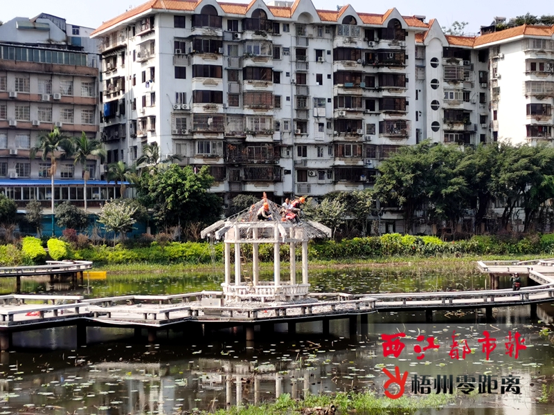 3月10日,潘塘公園荷花池內(nèi),施工人員正拆除池中的涼亭。近期,潘塘公園二期景觀提升工程正在施工,包括將現(xiàn)荷花池中的涼亭拆除后重建,以及在公園棧橋節(jié)點新建一座涼亭。此外,工程還涉及公園棧橋、完善環(huán)湖草坪燈等施工。 (記者 吳艷虹 攝)