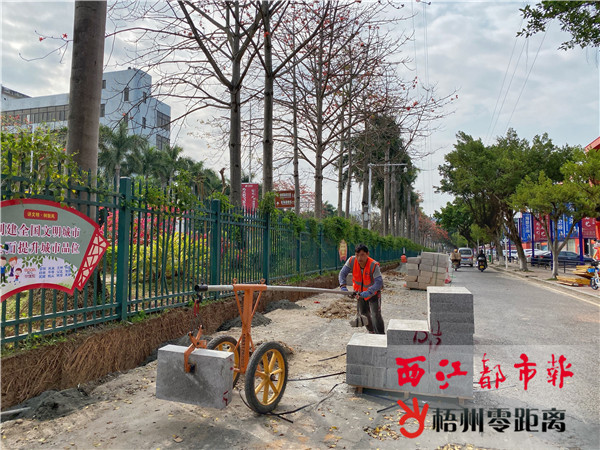 3月10日,施工人員在竹灣路輔道運送路沿石。據悉,自梧州市城區社會停車場及配套綜合提升PPP項目復工以來,我市多條道路提升改造工程陸續展開。近日,竹灣路也進入緊張的施工當中,施工人員將主要進行人行道及側分帶改造。若天氣情況良好,該路段道路施工預計4月中旬可完工。 (西江都市報記者 楊揚 攝)