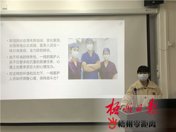 莫鎧妃在市紅會醫院講授心理課。(圖片由市第二人民醫院提供) 到現在為止,莫鎧妃進行了近8場心理輔導授課,每次課后看到接受心理輔導人員的輕松笑臉,她就有說不出的開心。不僅僅是因為她的付出收到成效,更重要的是一線醫護人員的負面情緒得到了及時的疏導。 “哪里有需要,我一定第一時間給予幫助。若沒有需要,我會隨時待命做好準備。”莫鎧妃說,疫情當前,為一線醫護人員做好心理輔導工作,是她的職責所在。守護好一線醫護人員的心理健康,才能讓大家堅信,等雪融化后看到的不是水,而是春天。
