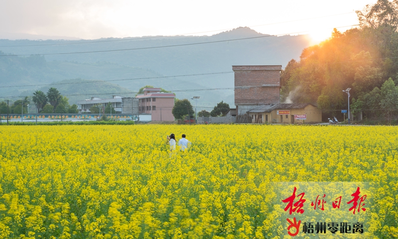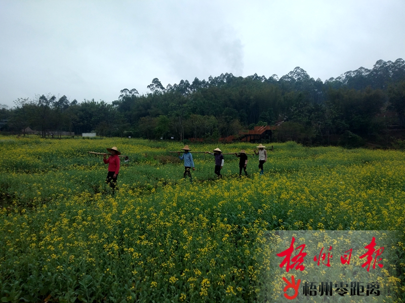 長洲區倒水鎮富萬村120多畝油菜花已盛開,3月13日,到田里勞作的村民走在開滿菜花的路上。潘卿 攝