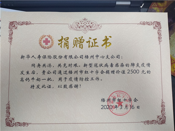 3月16日下午,在梧州市紅十字會醫(yī)院大門前,新華保險梧州中支通過梧州市紅十字會 為梧州市紅十字會醫(yī)院醫(yī)護人員捐贈了50箱牛奶,他們以微小的舉動為可愛可敬的一線醫(yī)護人員送上暖心的關(guān)愛。