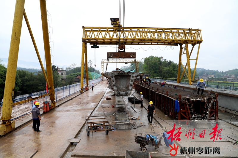 3月24日,在荔浦至玉林高速公路(蒙山段)項目建設現場,施工人員正在預制場進行立柱吊裝作業。