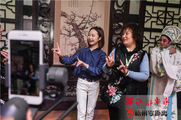 主播走訪梧州粵劇團,通過直播向廣大網(wǎng)民展示梧州粵劇文化的魅力。(記者 楊揚 攝) 直播中,梧州市演藝有限責任公司演員為觀眾送上了《梁山伯與祝英臺·十八相送》選段,精彩的表演引起了觀眾刷屏叫好。表演結束后,直播主持人還向梧州粵劇代表性傳承人陳靜學習了粵劇的表演技巧,并跟隨陳靜潛入后臺,向觀眾介紹舞臺準備、演員化妝的各個環(huán)節(jié)。 此次網(wǎng)絡直播持續(xù)一個多小時,到中午12時直播結束,當日直播累計總觀看人數(shù)達到93.8萬人次,火爆程度可見一斑。