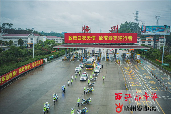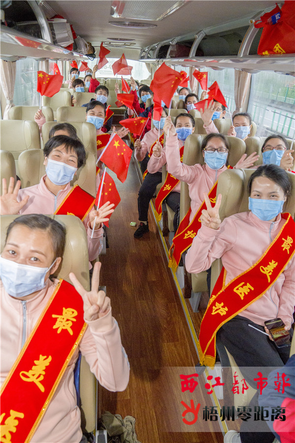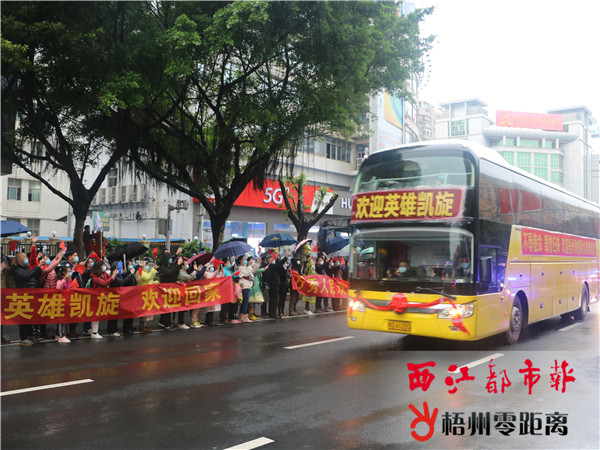 應到26人!實到26人! 歲暮天寒,他們白衣執甲,逆行出征;春暖花開,他們滿載祝福,平安回家。 昨天,我市舉行隆重的迎接梧州援鄂醫療隊員的儀式,歡迎結束在南寧休整的26位英雄凱旋。市民群眾或冒雨沿線守候,或觀看媒體直播,向醫療隊員致敬。 最高禮遇迎英雄 4月5日清晨7時15分,身披“最美醫護”的大紅綬帶,26名援鄂醫療隊員登上接他們回家的專車。南寧至梧州400多公里的路途,警車全程開道,沿途高速公路的LED屏顯示“向梧州援鄂醫療隊致敬!”,主流媒體全程直播醫護隊員的返家之路。