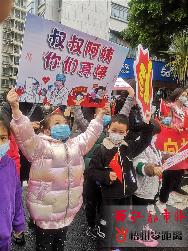 人群中,孩子們在為梧州援鄂醫療隊員們歡呼。 (圖片來源:梧州零距離) 戰無懼 歸無恙 一座城的熱度不是因為燈光,而是因為無數堅守的人們。這些援鄂醫療隊隊員當中既有父母的孩子,也有孩子的父母,還有愛人的妻子、丈夫。即將成家的最美新娘吳桐、陳曉艷;跟兒子承諾“打敗病毒怪獸”就回家的溫柔母親陳如均、梁燕露;不舍梧州美食卻第一時間報名參加援鄂抗疫的護士爸爸許勇、陳愷;直到工作接近尾聲才告訴家人工作內容的乖巧孩子鄧鳳萍…… 白衣執甲,他們戰無畏,在湖北抗疫形勢最嚴峻的時候,一聲令下,他們毅然辭別家人奔赴抗疫最前線。其間,梧州市先后5次派出52名醫護人員,“最美逆行”在梧州接連上演。他們在當地疫情最緊張的時刻到達戰場,甚至有病人“趕”他們回家,讓他們不要留在當地冒險。為了更好地救治病人,醫療隊員基本“4班倒”,每次值班要在隔離病區至少6個小時;為節省防護服,省去上廁所時間,還有醫護人員選擇穿紙尿褲“上陣”。 凱旋花開,他們歸無恙。在千里之外的戰疫一線,他們同時間賽跑、與病魔較量,出色地完成了救治護理任務,體現了梧州醫護人員的高素質。馳援武漢的17位隊員在全國首個方艙醫院奮戰到最后一刻,交出了病人零病亡、零回頭,醫護零感染的滿分答卷;馳援十堰鄖西縣的9位隊員,成為那個偏遠縣城堅強的醫療后援,從查房、診療、遠程會診到下沉基層參與防控工作,僅用數十天就被當地群眾視作沒有血緣關系的親人。 披上戰袍,他們是勇往直前的白衣戰士;卸下鎧甲,他們也有著普通人的繞指柔情。車外的群眾市民,冒著大雨十里長街一路相迎;車內的白衣戰士,眼里下著小雨揮舞國旗敬禮致意。