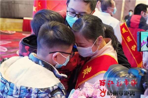 相聚時,市工人醫院主管護師姚華嬌與孩子相擁落淚。西江都市報記者 陳凡 攝 ■花絮 大巴演唱會 4月5日7時15分,天下著瓢潑大雨,但這并未影響隊員們歸心似箭的好心情。“我們來唱歌給觀眾聽吧!”得知醫護隊員的出發全過程將通過梧州市廣播電視臺、梧州零距離網對350萬市民直播,我市第一批援鄂醫療隊的隊長陳如均,向車上的第一、二批援鄂醫療隊的隊員們發出了獻聲回報觀眾的號召。 很快,大巴就成了醫護人員合唱演唱會,《我和我的祖國》《真心英雄》《山歌好比春江水》等歌曲輪番演繹……一開始,醫護人員面對媒體的直播鏡頭還有些羞澀,經過幾首歌的預熱后,大家越唱越歡,“人多勢眾”的第一批援鄂醫療隊員還向第二批援鄂醫療隊員提出了“對山歌”的挑戰。“工醫周杰倫”“人醫孫燕姿”……醫護人員們紛紛一展歌喉,輕松唱起各自的拿手好歌。 “我還是曾經那個少年,沒有一絲絲改變”……醫護人員集體唱起抖音神曲《少年》,將“演唱會”推向高潮。這些醫護人員在湖北抗疫一線是“拼命三郎”“拼命三娘”,他們在脫下白大褂結束工作后,就是一群愛唱歌、愛開玩笑的普通人。 提前來守候 12時40分左右,新興三路梅西生活廣場路口,在歡迎的人群中,一支由30多名身穿統一藍色服裝的人組成的隊伍特別引人注目。他們不停地揮動小紅旗,再合力拉起一塊橫幅,不時喊著“梧家英雄,歡迎回家!”的口號,在雨中翹首以待梧州援鄂醫療隊歸來。 原來,他們是自發來參加梧州援鄂醫療隊返梧歡迎儀式的梧州玫瑰湖跑團的成員。“我們約定集合的時間為12時30分,但是,有的團員按捺不住激動的心情,11時左右便已經到了梅西生活廣場等待白衣英雄歸來。”團長李天成說,援鄂醫護人員是勇敢逆行的英雄,他們舍小家為大家、奮戰在戰“疫”一線,這種勇于擔當、甘于奉獻的精神讓跑團的成員們都深感敬佩。 莊嚴敬隊禮 下午1時,梧州市工廠路小學10歲學生劉子彥佩戴著紅領巾,拿著小紅旗,穿著雨衣站在奧奇麗路,急切地等待著梧州市援鄂醫療隊車隊的到來。當車隊駛進奧奇麗路,劉子彥立即立正注視車隊,并舉起右手,莊嚴地向醫務人員敬隊禮。 “我從‘梧州零距離’微信公眾號上知道援鄂醫療隊的叔叔阿姨今天回家的消息后,就和媽媽商量要到現場迎接他們。”劉子彥說,這兩個月以來,她從電視節目和學校網絡課程上看到許多關于醫務人員及其他疫情防控工作人員的動人事跡,覺得他們很英勇,值得大家尊重。于是,她便想戴著紅領巾加入到迎接白衣英雄歸來的隊伍當中,向醫護人員敬隊禮,以表達自己崇高的敬意。 貼心小禮物 在迎接梧州援鄂醫療隊員的儀式上,醫療隊員們的孩子都來迎接英雄父母了,大多還帶著自己準備的小禮物,這讓一直思念孩子的醫療隊員們不禁紅了眼。 姚華嬌10歲的女兒折了一串千紙鶴,拼成“媽媽歡迎您回家”的字樣,綁在送給媽媽的捧花上;許勇3歲的小女兒,抱著比自己高一倍的許勇Q版人形海報來迎接爸爸,儀式結束后,她又給爸爸送上了自己手制的獎杯和獎狀;鄧忠天曾說自己一家人都內斂不愛出現在人多的場合,但是,歡迎儀式后,他的女兒卻拿著為爸爸準備的小禮盒,在舞臺上等待與他合照;梁燕露出發馳援湖北時沒有告訴兒女們她的去向,但她始終掛念著一雙兒女,看到來迎接自己的兒女,她高興地把自己獲得的“最美醫護”的獎牌作為禮物送給了孩子…… 西江都市報記者 陳素雅 姚藍婷