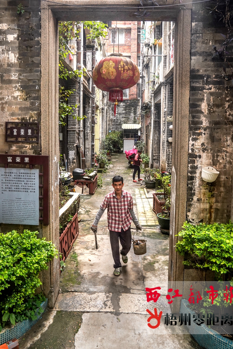 ③富榮里位于維新里內(nèi),其巷口牌坊為梧州目前僅存的水磨青磚牌坊。 今年63歲的胡敏安,跟隨父輩一直居住在這條街區(qū)。哪棟房子的木雕門最好看,哪棟房子外墻繪畫最精美,他熟稔于心。“建設(shè)路三巷1號,是金龍巷民宅的‘典型代表’。”順著胡敏安手指的方向,有著精致雕花房梁的大宅出現(xiàn)在眼前。盡管民宅已經(jīng)較為破舊,但內(nèi)里用于裝飾的木質(zhì)窗花、房瓦下依稀可見的墻面繪畫,似乎還在向今天的人們訴說著當(dāng)年的歷史。
