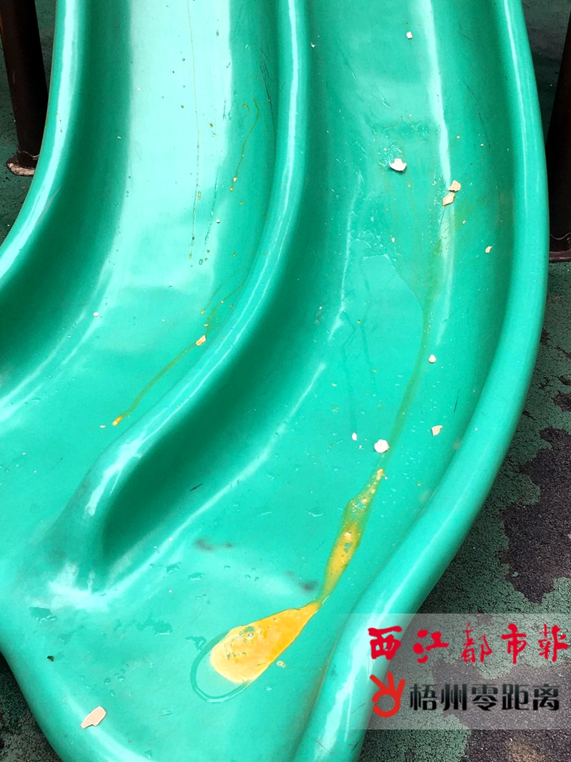 4月11日,從天而降的雞蛋砸在兒童樂園的滑梯上。 (小區業主供圖) “這種情況不是第一次發生了。”小區另一名住戶朱先生向記者透露,上個月兒童樂園內也發生了類似事件。事件同樣發生在中午時段,他在帶孩子玩耍的過程中,突然見到不明來源的雞蛋從天而降,掉到兒童樂園里,所幸沒有砸到人。因此,近段時間以來朱先生已減少了帶孩子到兒童樂園玩耍的次數。 相關事件在小區業主微信群里引起了熱議。有不少住戶反映,兒童樂園被砸雞蛋的事情已經不是第一次發生,希望小區物業管理方及相關職能部門能幫忙協調解決。此外,也有部分業主提出,或許是孩子們中午時分在兒童樂園玩耍時,玩鬧的聲音太大,吵到樓上的住戶,引發樓上住戶丟雞蛋下來,如果兒童樂園在中午休息時段不開放,可能“高空砸蛋”的情況將不再發生。 警方:多次接到居民投訴 4月13日上午,記者來到香樟園小區,向小區物業管理方了解相關情況。據小區物業管理工作人員介紹,4月11日,小區物業管理方接到幾名業主的反映后,馬上派出保安人員到現場,發現確實有雞蛋砸到了兒童樂園的滑梯上,保安人員隨后報警。 小區物業管理工作人員表示,兒童樂園被丟雞蛋的情況的確不是第一次發生,小區內還存在其他的高空拋物情況,物業管理方曾經逐戶上門對住戶進行提醒,還在每個樓棟張貼了禁止高空拋物的溫馨提示,但類似情況仍時有發生。 4月13日早上,龍骨社區居委會工作人員及角嘴派出所(合署)的民警也來到小區就此事進行了解。據角嘴派出所(合署)方面表示,近段時間警方多次接到該小區居民關于高空拋物的投訴,因此,警方也就高空拋物的危險性及相應處罰規定進行了提示。當天上午,物業管理方已將警方提示張貼出去,并且發到了業主群,希望能讓大家警醒,杜絕小區高空拋物現象。