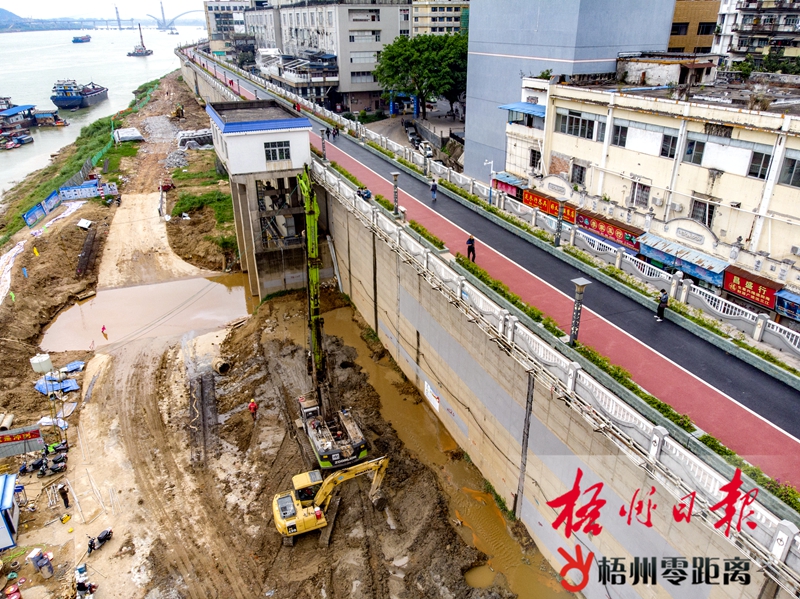 近日,有關部門組織人力機械,對河東防洪堤進行加固改造。目前,施工人員正對河東防洪堤西江段外側進行灌注樁施工,加固防洪堤,同時也為未來在灌注樁與原堤防擋水墻之間新建平臺步道做準備。
