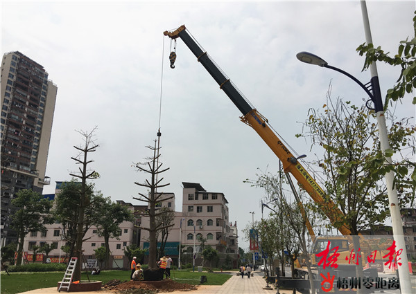 4月19日,工作人員正在迎賓路西側轉角小綠地補植樹木。