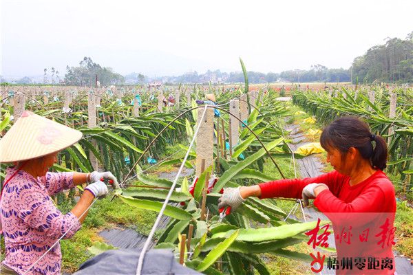 當前,正值火龍果樹生長期,果農抓住開花前期,加強火龍果樹的護理,穩固果樹,扶正枝條,促進保花保果,為實現增產豐收打下良好的基礎。 江永錄 攝