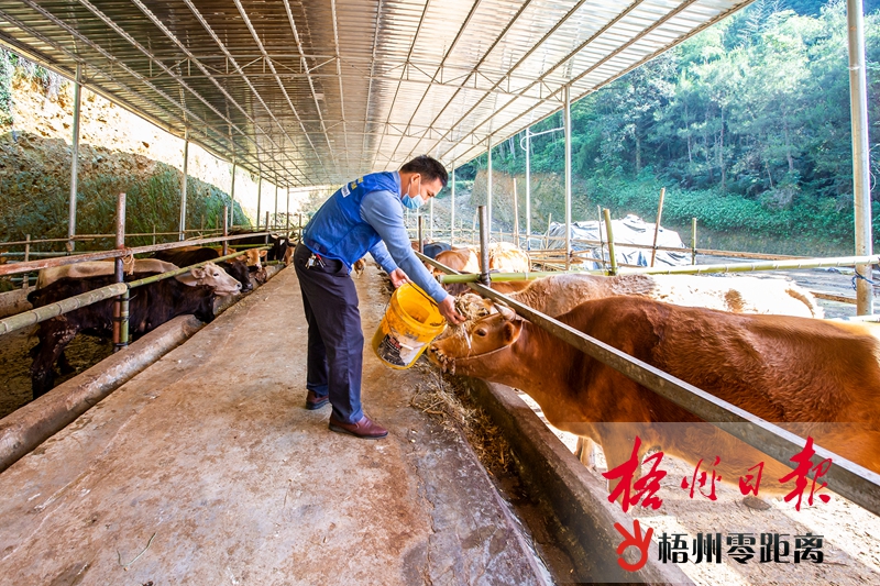 4月27日,蒙山縣黃村鎮百合村第一書記黃建源在給村辦企業肉牛養殖場肉牛喂料。