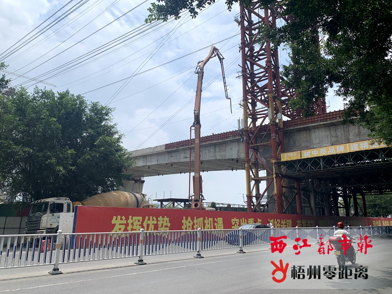 5月1日,西江四橋北岸第一聯跨西堤路段防撞墻進行混凝土澆筑施工。