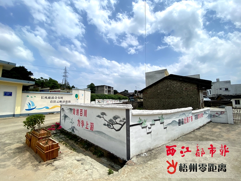 5月7日,高山、松樹、牡丹、中式屋檐等圖案以水墨畫的形式出現在岑溪市平爐村的圍墻和房屋上,經過美化的鄉村面貌令人耳目一新。記者 楊揚 攝