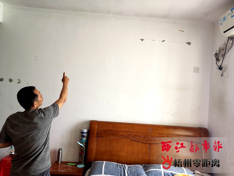 梧州零距離網-西江都市報訊(記者 紀榮蘭)近日,有龍圩區居民反映,龍圩區下廓街河堤里1號江南明珠小區和沿江路136號龍翔百匯小區,疑因江面航道炸礁導致小區部分房屋墻上出現裂縫,居民希望相關部門能減少炸藥用量,并及時安排相關工作人員處理房屋墻體裂痕的問題。4月30日,記者來到上述兩個小區進行走訪。 臨江小區墻體開裂 據設置在外墻的工程銘牌顯示,江南明珠小區竣工時間為2014年7月,房屋共120套;龍翔百匯竣工于2015年6月,房屋共432套。記者還了解到,兩個小區臨江而建,入住率達到90%以上。 江南明珠小區是一個無物業管理小區,自從墻體開裂的情況發生后,小區業委會成員李先生就開始對整幢樓的外墻及房屋出現明顯開裂的住戶戶數進行統計標注。“樓房主體外墻開裂的地方我已經用紅圈標注,共有20多處,涉及100戶居民。大家普遍認為,墻體開裂與江面的爆破作業有關。”李先生說。 記者在現場看到,該居民樓外墻確實出現了多處開裂的現象。在8樓的黎女士家中,客廳、房間、衛生間均出現了不同程度的墻體開裂情況,部分墻體膩子發生脫落。