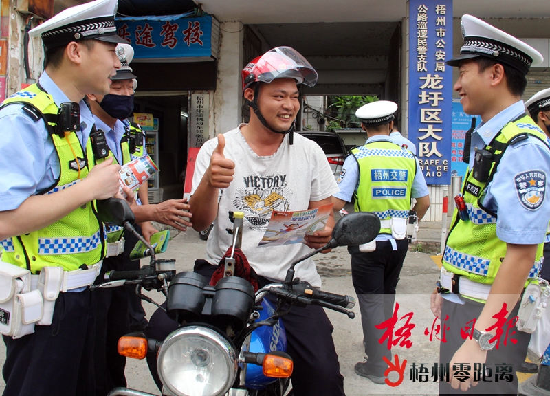 5月17日上午,市公安局交警支隊在龍圩區世紀廣場舉行“一盔一帶”安全守護行動主題宣傳活動。 活動中,民警們通過發放宣傳資料、擺放“一盔一帶”交通安全宣傳展板等形式,向廣大群眾宣講佩戴安全頭盔和系好安全帶的重要性。梧州日報記者 陳素雅 通訊員 石桂暉 攝