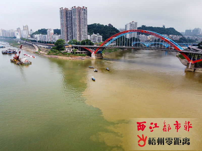 5月18日,渾濁的桂江水匯入清澈的潯江,使得“鴛鴦倒掛”現象再現。 受桂江上游連日來降雨影響,桂江水泥沙含量增加,而潯江相對清澈。兩江交匯處呈現出與往日“潯濁桂清”現象相反的景象。